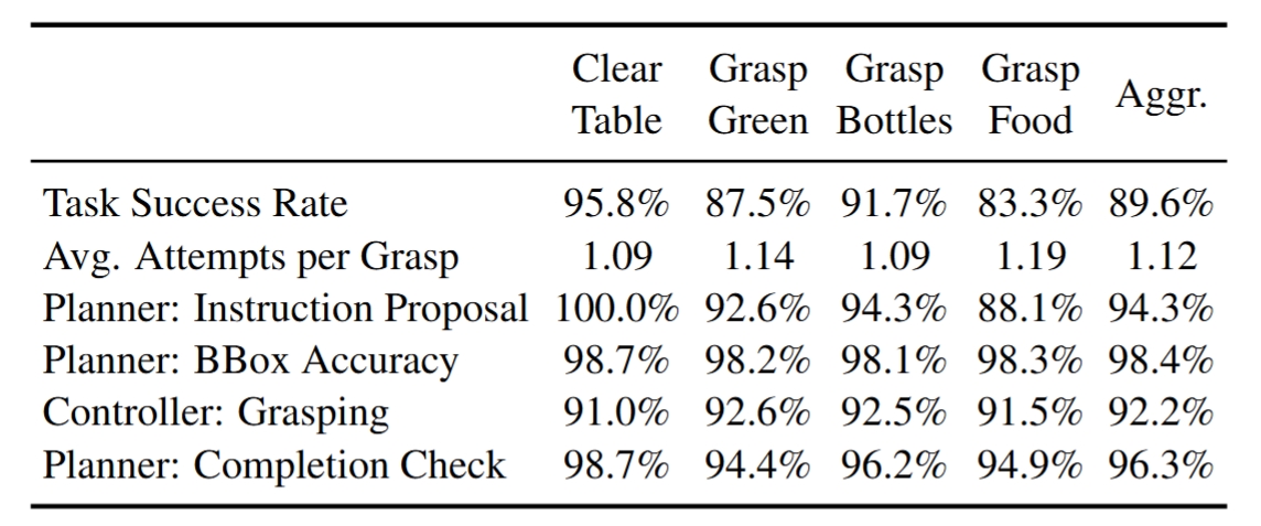 During the controller's grasping process, the planner monitors the execution and triggers a scripted placing motion when grasping succeeds. After each grasping attempt, the planner resets the robot and proposes a new grasping instruction. This process continues until the user prompt is fully completed.